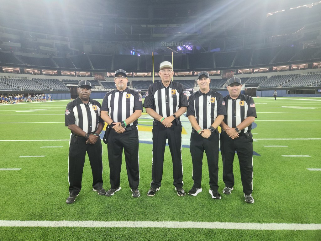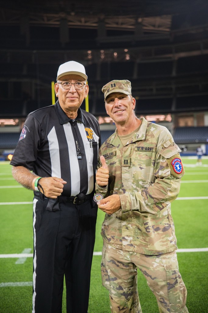HL – Luther Wilson, U- Dave Mushinskie, R – Art Andrade, BJ – Jeff Young, LJ – Don CoryU-Jacob Houser, LJ- Ron Snyder, R-Max Hernandez, BJ-Garret Earls, HL-Anthony PriceL to R – SSG Garcia, CPT Aguilera, Referee-Art Andrade, SSG Dekker, Umpire-Dave Mushinskie, CPT Taylor (photo by SFC MaGee)Referee Art Andrade presents CPT Aguilera with the FCFOA coin used for the coin flip